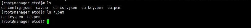 $ cfssl gencert -ca=ca.pem -ca-key=ca-key.pem -config=ca-config.json -profile=etcd server-csr.json | cfssljson -bare server